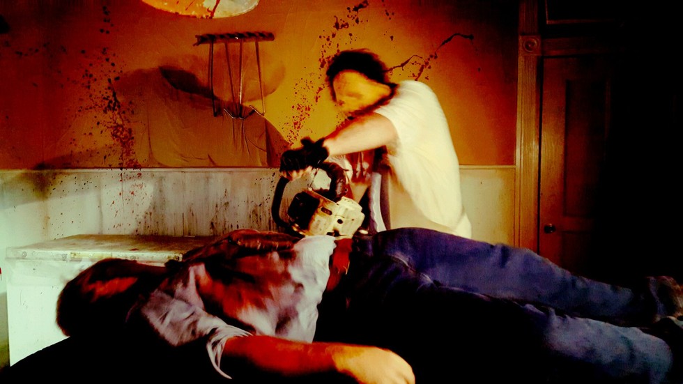 Leatherface having some fun grinding up a victim in the Texas Chainsaw Massacre House