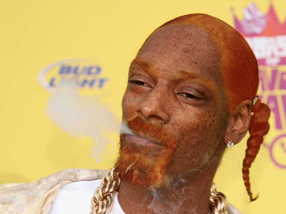 Believe me; I'm trying like the Dickens to see the Dogg Father with red hair, freckles, and a matching goatee. It's not working. But if you think about it, Snoop has smoked so much ganja that it makes sense that he's turned fiya-red.